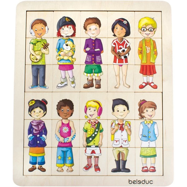 Puzzle en bois avec motif des enfants du monde. Plus d’options de jeuassemblez les pièces correctement, assemblez-les en croix ou jouez à des jeux de mémoire. Renforce la motricité fine, la concentration et la connaissance de la diversité et des autres pays des enfants. 30 pièces