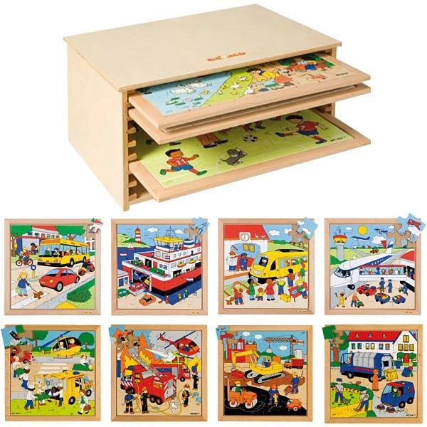 Support de rangement en bois pour 8 puzzles. L’étagère est astucieuse et pratique, et il est facile de retirer les puzzles lorsqu’ils doivent être utilisés et de les ranger à nouveau pour que les pièces ne disparaissent pas. Incl. 8 puzzles de taille 34 x 34 cm. avec 16 – 36 pièces