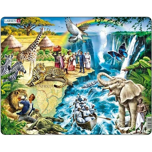 Casse-tête montrant David Livingstone naviguant sur le fleuve Zambèze et avec les chutes Victoria en arrière-plan. Un joli puzzle qui favorise également l’apprentissage. 81 pièces