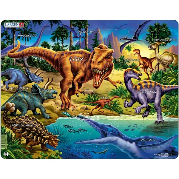 Puzzle en carton avec motif de beaux dinosaures du CrétacéT-Rex, Wintonotitan, Quetzalcoatlus, Parasaurolophus, Velociraptor, Triceratops, Troodon, Iguanodon, Ankylosaurus, Pliosaurus. 57 pièces