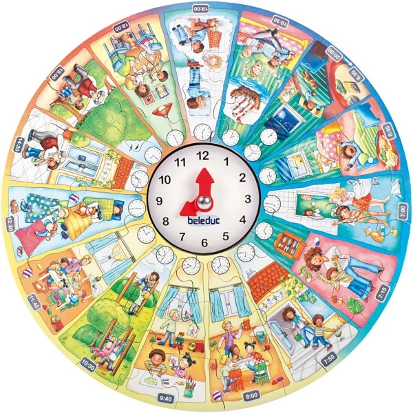Puzzle informatif avec horloge. Avec la possibilité pour les enfants en cours de route de raconter leurs propres expériences, de développer leurs compétences linguistiques et de maîtriser les concepts de base. Renforce la motricité fine, la concentration, la capacité d’observation et la compréhension du temps des enfants. 48 pièces