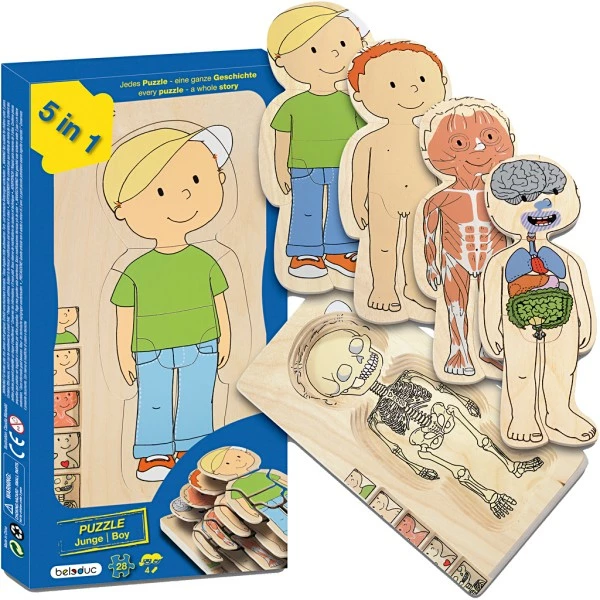 Des puzzles passionnants qui, couche après couche, montrent l’intérieur du corps, du squelette jusqu’à ce que vous soyez habillé