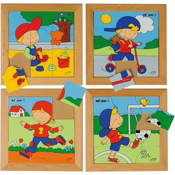 4 puzzles en bois avec des motifs d’un garçon faisant différentes activités. Les puzzles développent la motricité fine et la capacité de concentration de l’enfant. Dim. 20 x 20 cm. 9 – 12 pièces