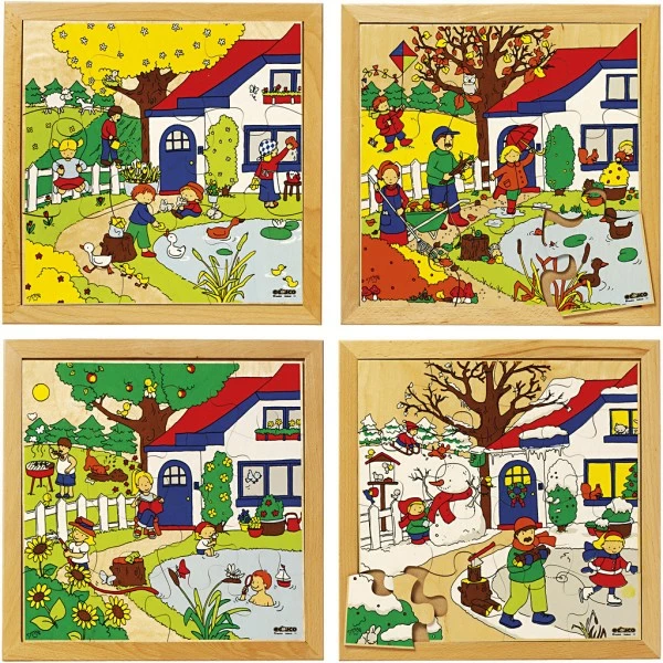 4 puzzles en bois qui donnent lieu à une conversation sur les différentes saisons. Contient de nombreux détails et de belles couleurs. 9 – 16 pièces