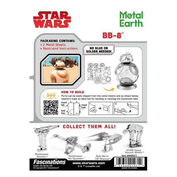 Découvrez ce Kit Maquette en métal pour tous les fans de Star Wars qui vous permettra de réaliser une magnifique maquette en métal représentant BB 8. Grâce aux maquettes en métal Metal Earth vous pourrez réaliser des miniatures en métal qui s’assemblent sans colle uniquement à l’aide d’une pince de précision ou d’une pince à épiler. Le montage se fait en détachant délicatement les pièces de leur support, puis en les pliants et en les emboîtant les unes aux autres en suivant les instructions.