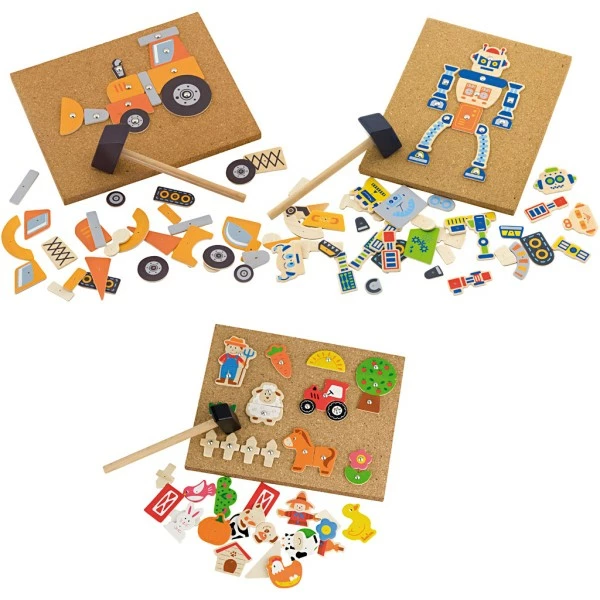 Ensemble de mosaïques Hammer avec des pièces en bois peintes qui peuvent être assemblées selon les cartes de tâches ou transformées en quelque chose de libre imagination. Défie l’observation, l’imagination, la créativité et la coordination ?il-main des enfants. Pièces en bois, planches de liège, marteau, clous et cartes à tâche