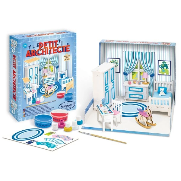 Ce kit Puzzle 3D Petit Architecte Chambre à coucher plaira beaucoup aux enfants à partir de 7 ans. Plus qu’une simple boîte de puzzles, ce kit permet de réaliser une maquette de Chambre à coucher qui sera idéale comme décor de jeu. En assemblant les éléments de la Chambre à coucher, l’enfant pourra ainsi réaliser un bel assemblage et s’amuser à le décorer par la suite : L’enfant se transforme en décorateur d’intérieur. Avec ce coffret, il devra peindre les meubles, choisir les tissus et les couleurs pour la chambre. La pâte à modeler, quant à elle, lui permettra de faire le dessus de lit matelassé, les coussins, les nounours ou encore le bougeoir et les livres.