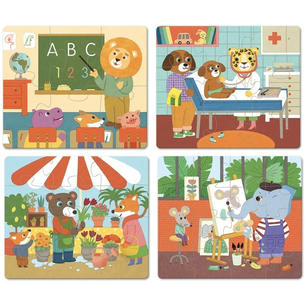 Découvrez ces 4 puzzles évolutifs de 6, 9, 12 et 16 pièces sur le thème des métiers pour les tout-petits dès 2 ans.